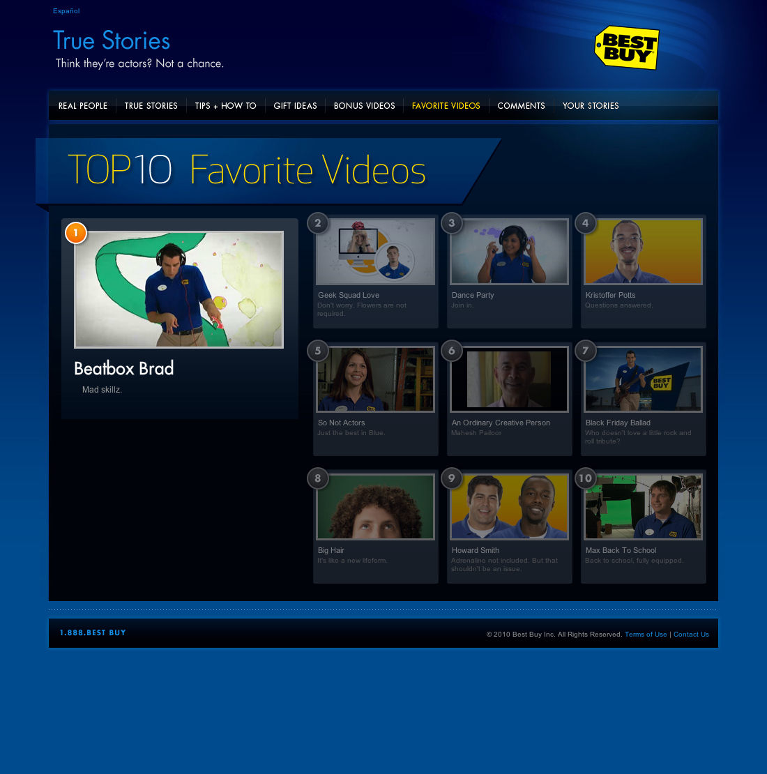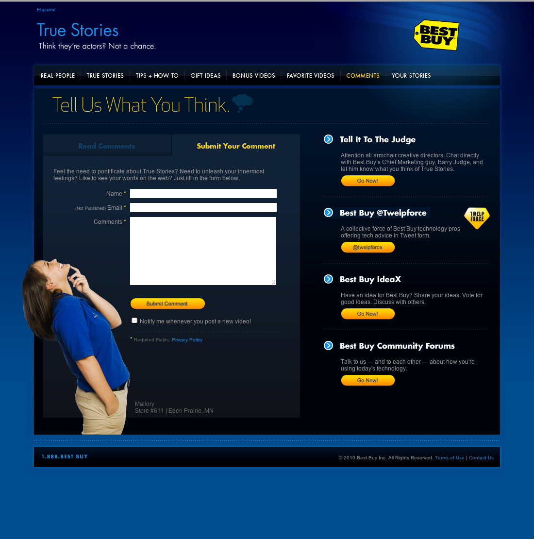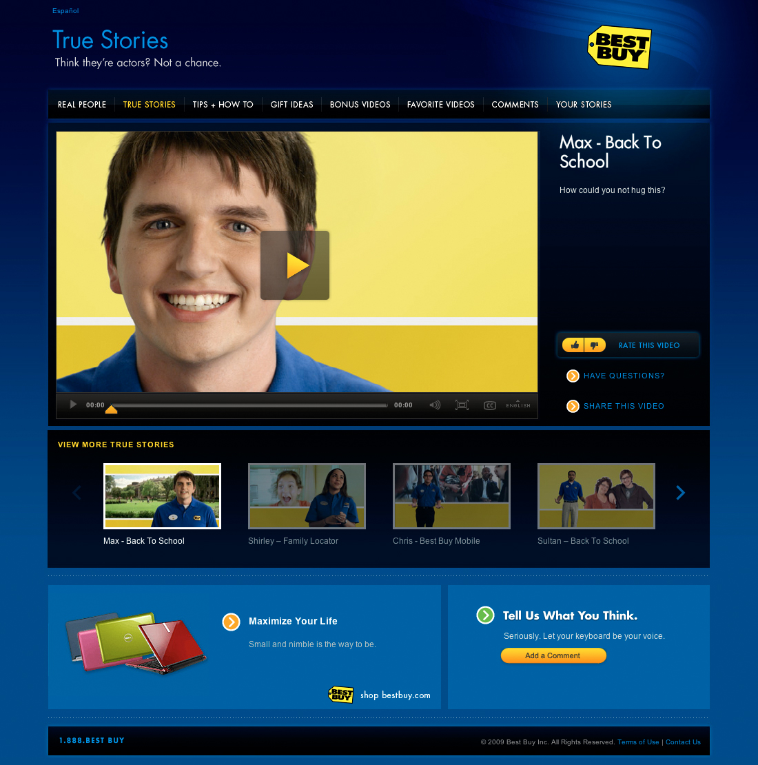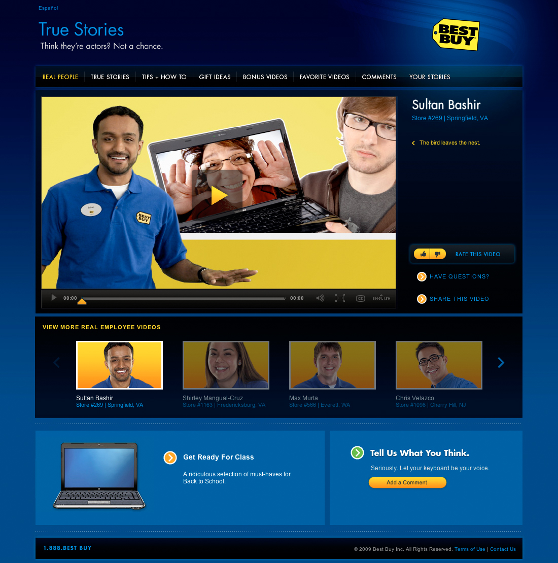 When the Best Buy CMO asks for a campaign-supporting website to be built and published in less than a month, the only answer is “No problem.” The same answer applied to all the behind-the-scenes content I directed, as well. The True Stories campaign has been retired, but these screen captures give you an idea of how real employees helped to promote Best Buy.