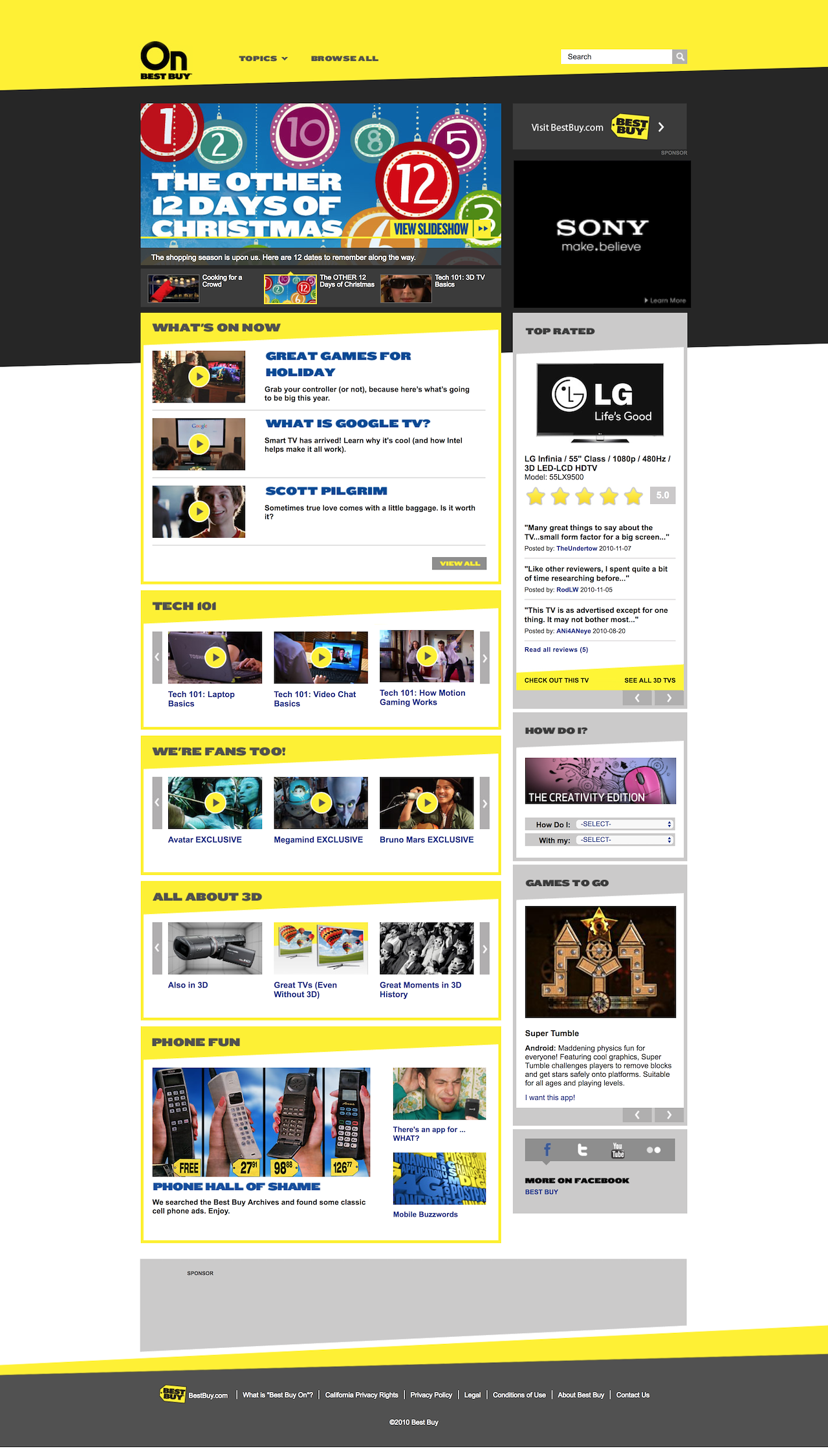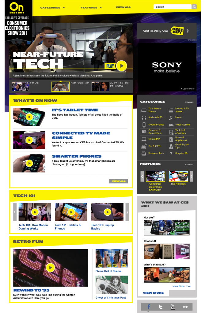 As part of the multi-channel media network team at Best Buy, I helped lead the creative development, editorial calendar, content creation, live event coverage, copywriting, UX, agency management and quality assurance for the company’s entertainment and CE info site, bestbuyon.com.